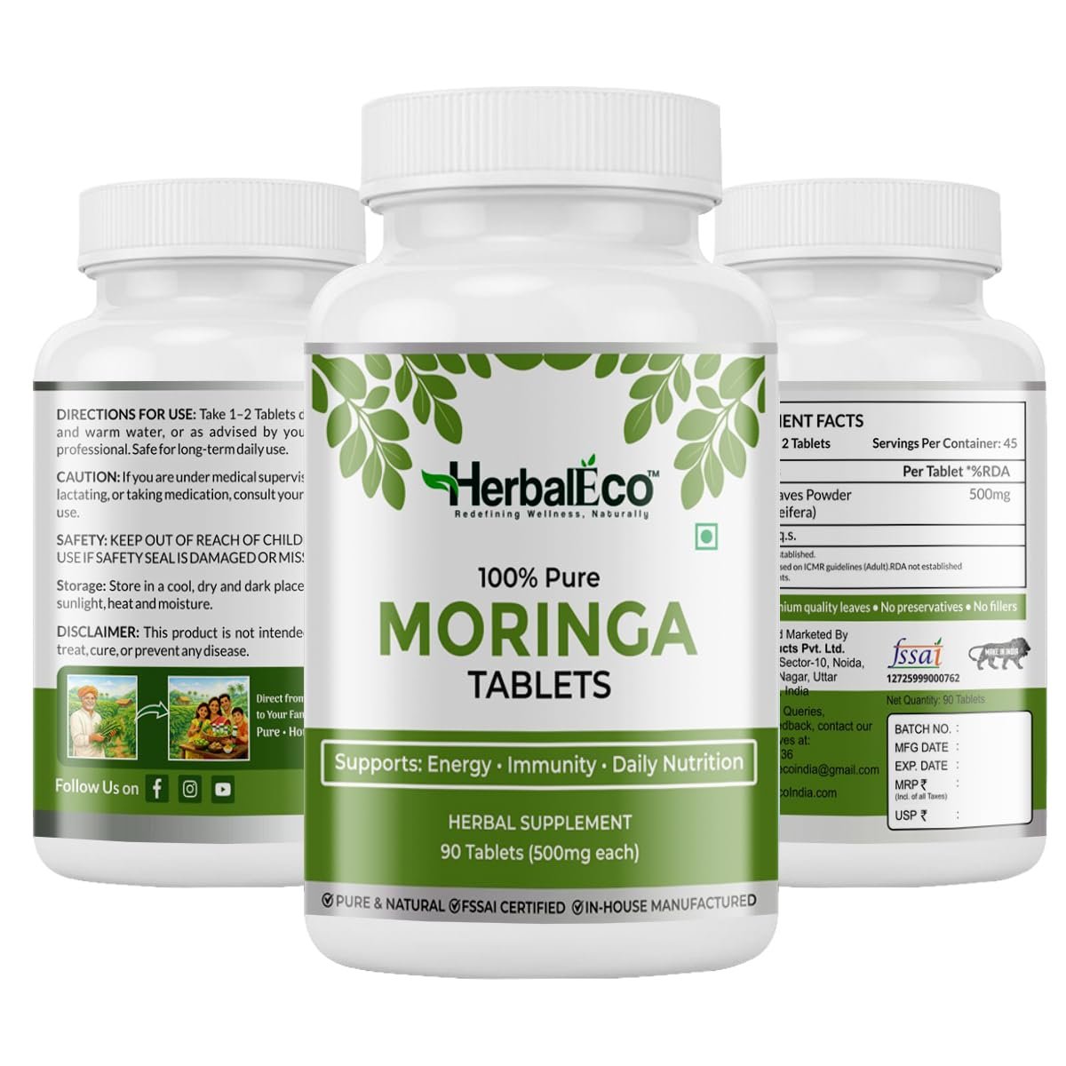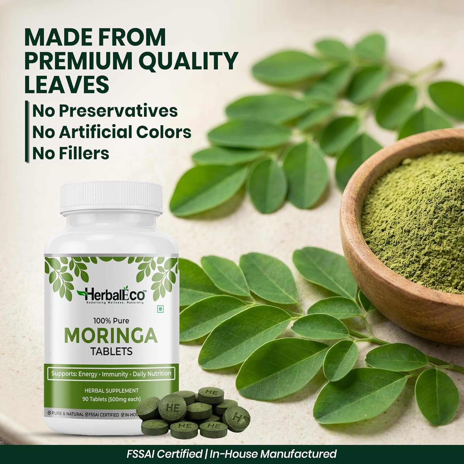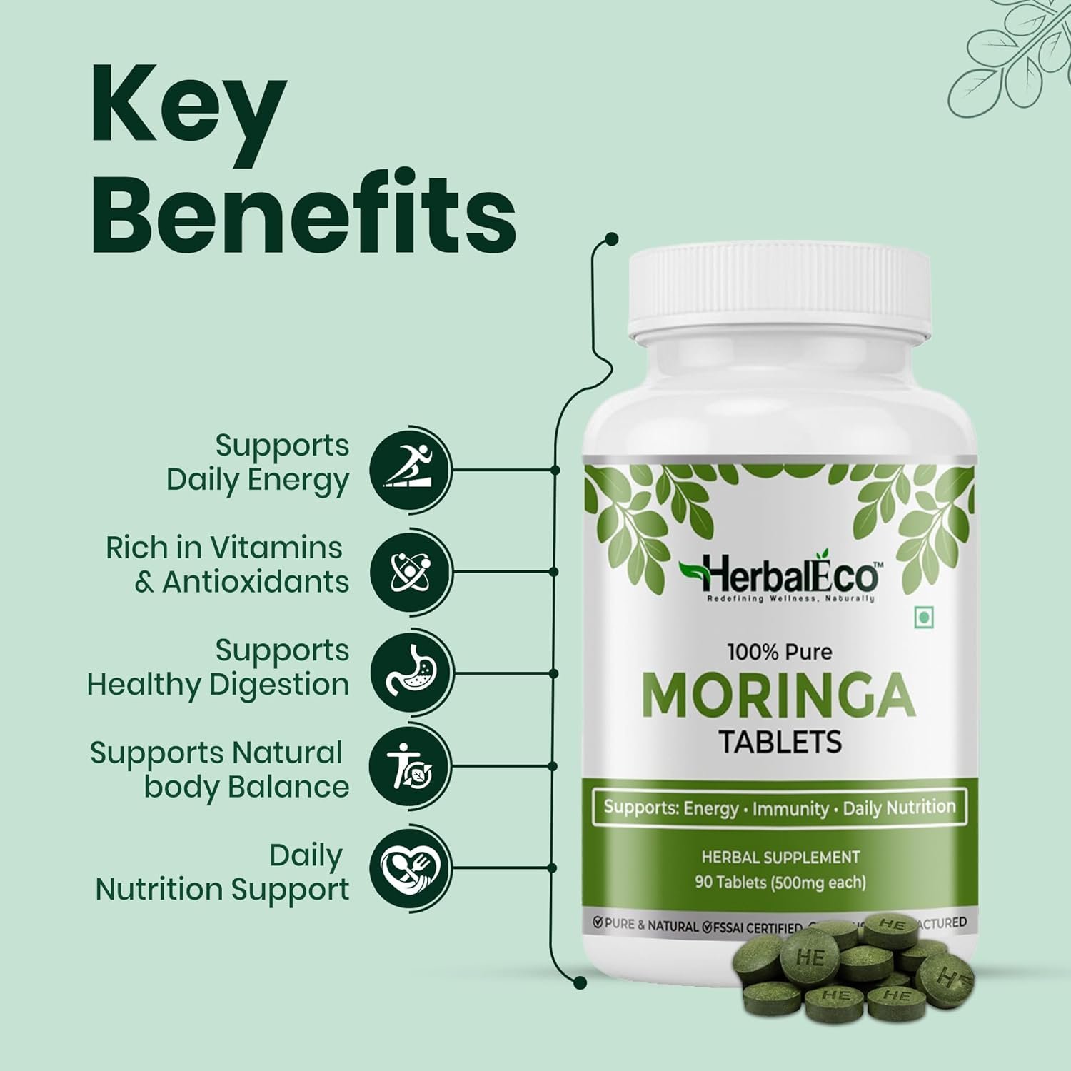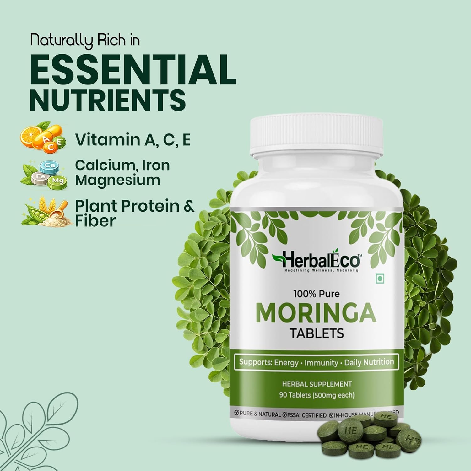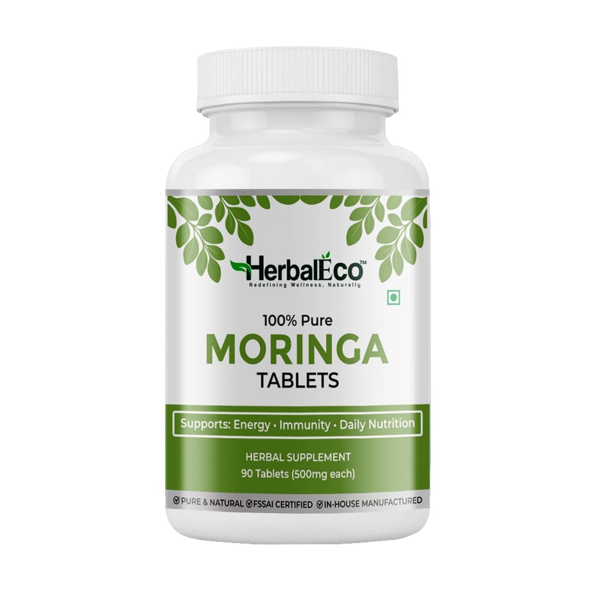 HerbalEco Moringa Tablets 500mg | 100% Pure Moringa Oleifera Leaf | Supports Energy, Immunity & Daily Nutrition | 90 Veg Tablets